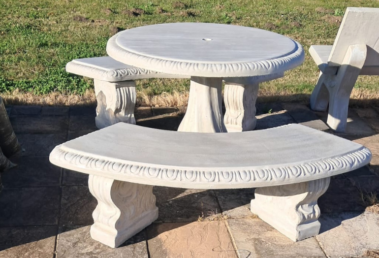 Our products include concrete table and bench sets, which consist of round tables with curved benches and rectangular tables with straight benches. Our park benches (the ones with backrests) are very popular. All our furniture is reinforced with steel. There is a variety of garden pots available, and they are made with a strong concrete mix and additional reinforcing.